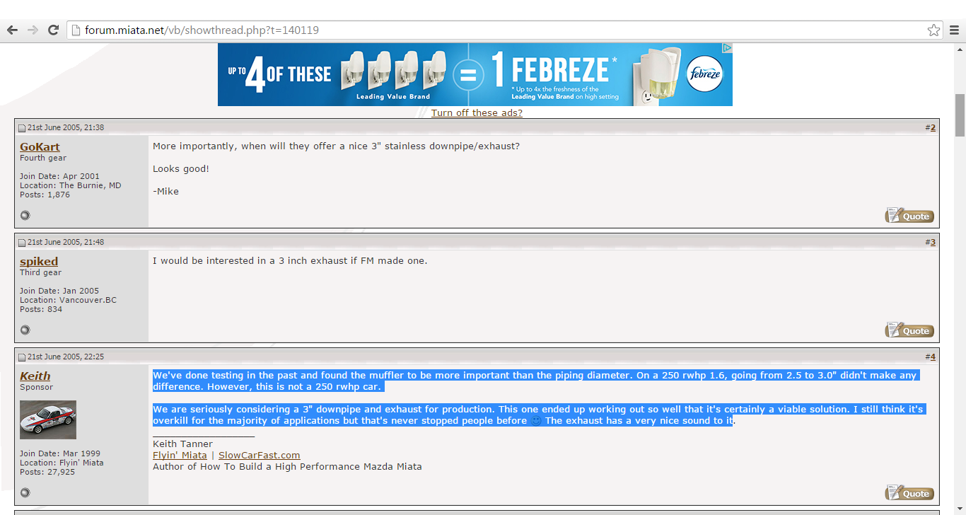Just to stir the pot id like to point out that i once went (over and over and over) 134mph in the 1/4th on a 2.5 inch exhaust (in a rush and had only that material laying around at the time) in a much heavier car then a miata. This was also a fairly average trap speed for a similar setup car so nothing really pointed that it was the end of the world and was robbing 900000whp.