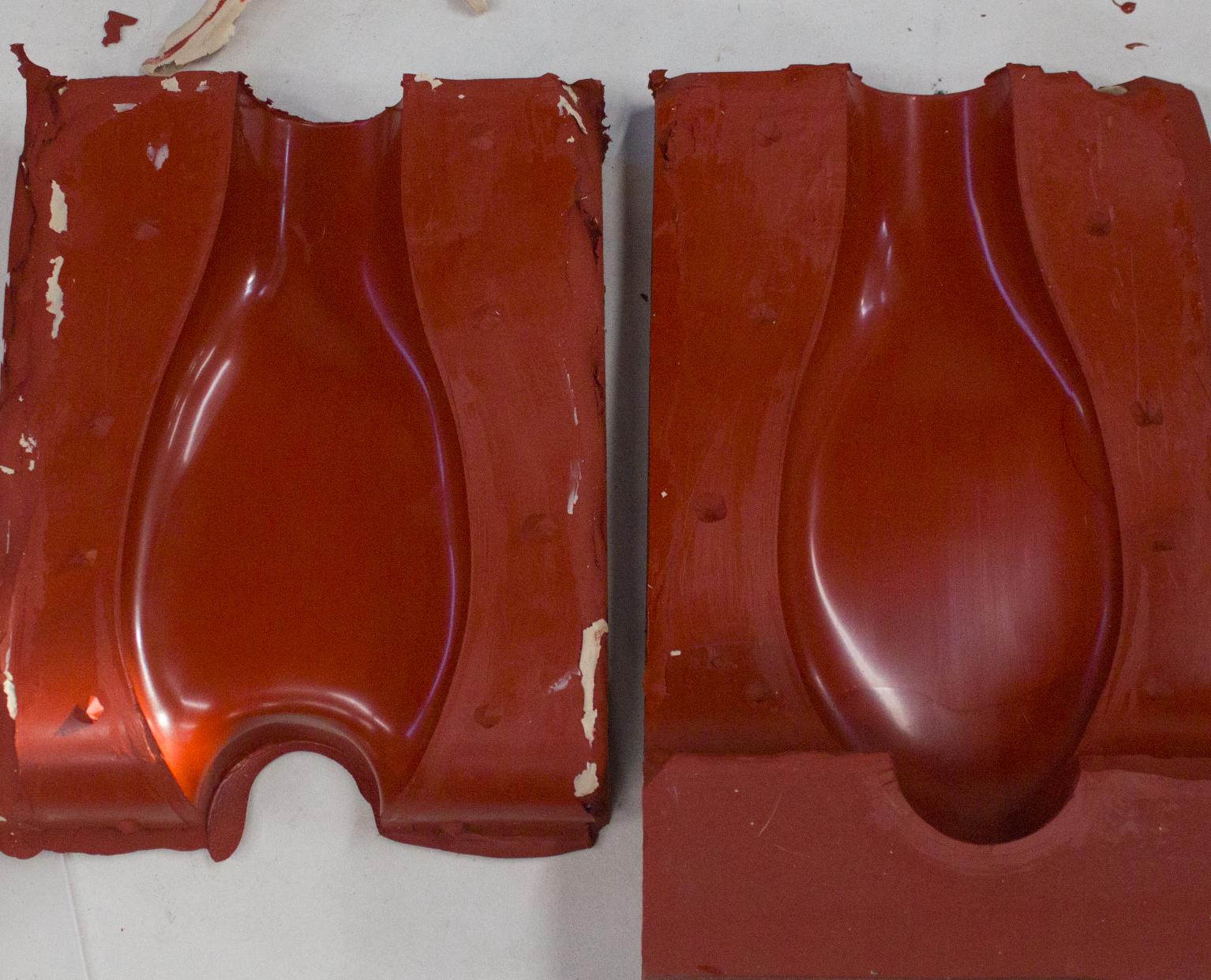 I started pouring silicone for the molds. After this first half gallon pour, my ebay vacuum chamber's gasket failed so now I have cured silicone for an incomplete part. Hopefully new silicone will bond to cured silicone and I won't have to redo all the clay work on these parting lines: