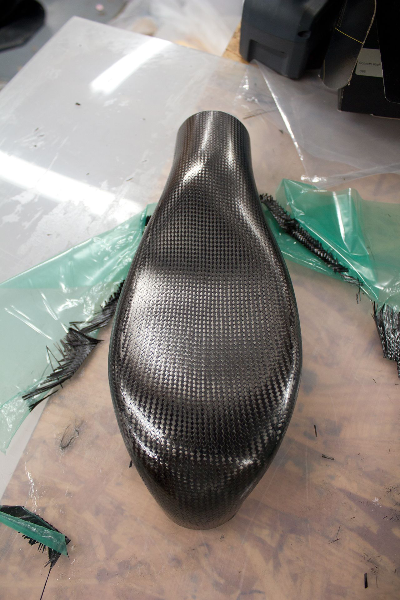 I am getting better at this but trimming, joining, finishing take way longer than I had hoped. It goes in the oven 3 times. First to laminate the halves, then I throw it in at 140F to cure the structural epoxy faster, and then again when I laminate the carbon strips over the joints. This one came out looking nice.