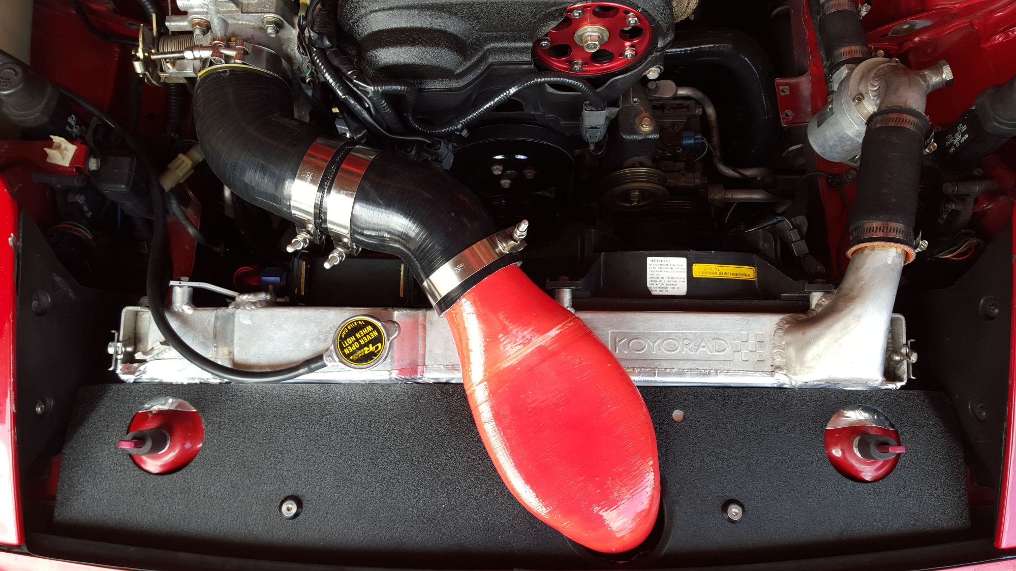 Someone on miata.net had their printed plastic duct fail. It warped and shrank until it was a really narrow opening. I haven't tested aluminum radiator surface temps, it might be a good idea to throw a small piece of something like header wrap between the duct and the top of the radiator to force a gap.