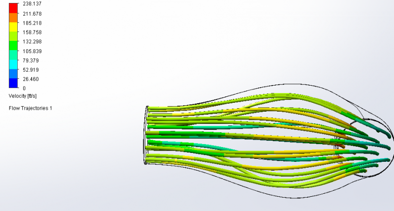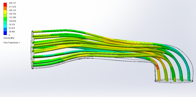 Here are the pics. Usually I figure out what the max CFM is for a given HP then set a pressure drop across the tube to achieve that flow. In this case 0.2 psi differential for 275 cfm. Then I look at the velocity and you want linear flow (no swirl) and no major velocity changes. Where it makes the 90 bend is the area you want to focus on but there's not much you can do there do to geometry constraints most likely. Typically I will iterate the design and run the CFD same mesh size and boundary conditions and compare to see how much CFM I gained, or lost, due to the changes.