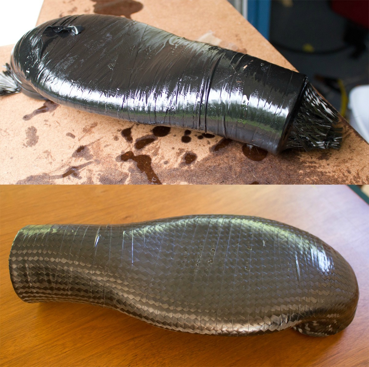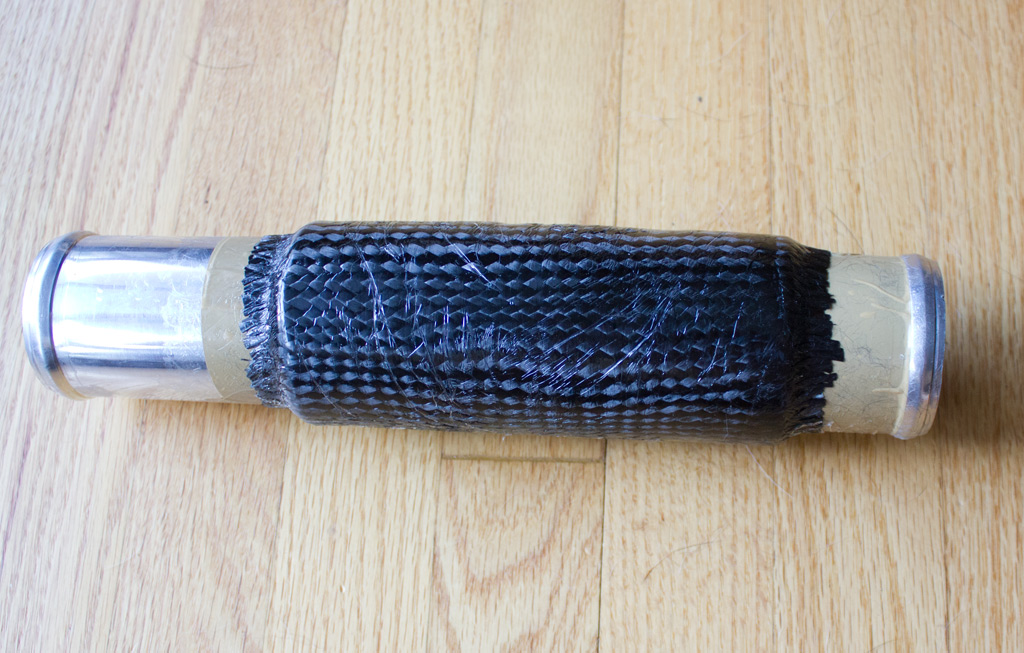 I did a test layup using one of the older prototypes. I don't have vacuum bagging equipment yet so I did a hacky compression wrap with electrical tape. Aside from excess resin puddling into streaks on the surface, it worked really well. I used a single layer of 15oz carbon biaxial sleeve and the part is super strong now- I was able to stand on it without breaking it.