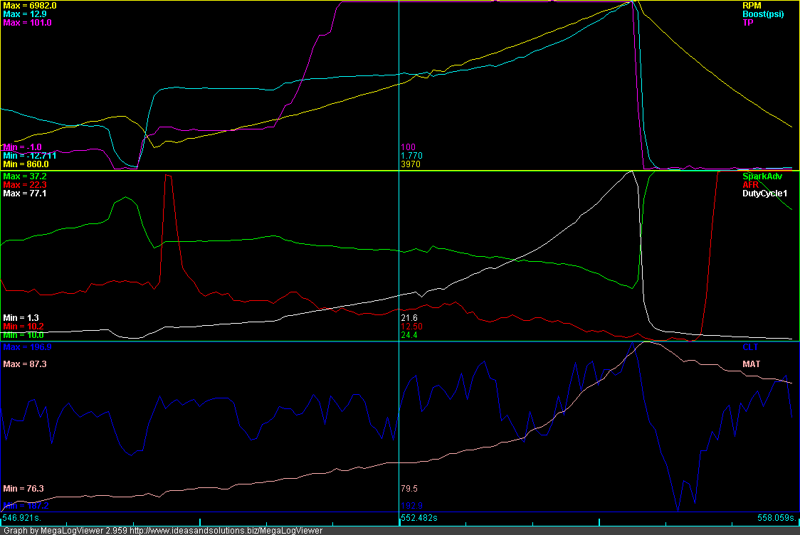 I disconnected the actuator. I then set the red line to 6,500, and ran the car to red line. Then, I set the redline to 6,800 and finally to 7,000 so that I can get more data points. Every time I ran the car to red line in 1st and 2nd gear and noted the max psi at redline for 1st gear as well as 2nd gear. I did a couple of runs for each condition. The outside temperature was about 30-35F. The data:
