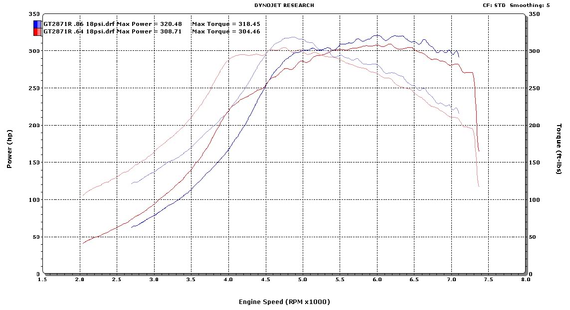 Having trouble finding GT2871R .64 vs .86 comparison. BUt then there's the newer GTX series:
