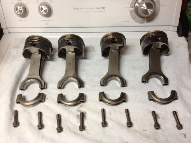 I bought the car as a project expecting to see a stock bottom end. What I found is fully built motor that failed. These are Wiseco K556M84 (84mm) pistons with huge rods. This motor also had ARP head studs. It looks like the bore size was just a bit big and the previous owner was getting on it before the engine got fully warm which caused piston slap.