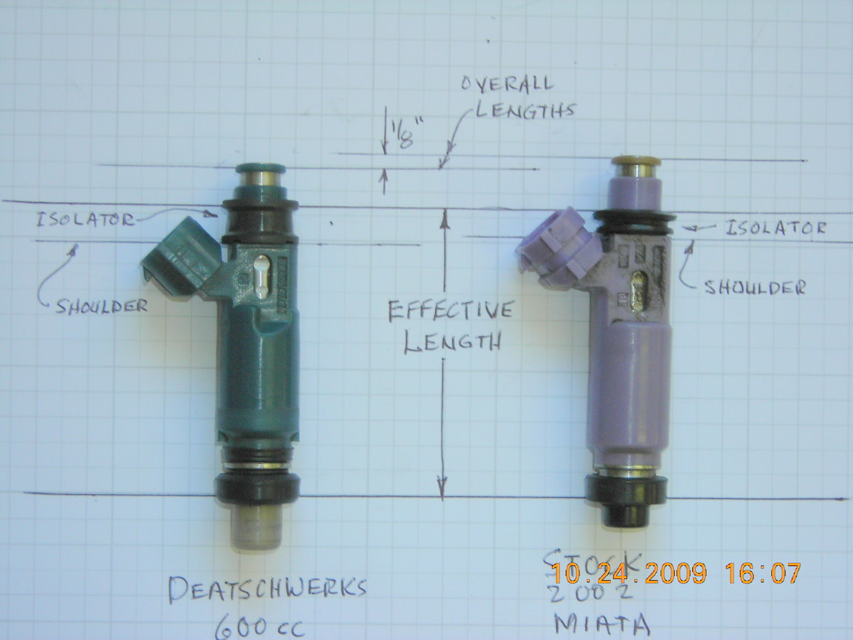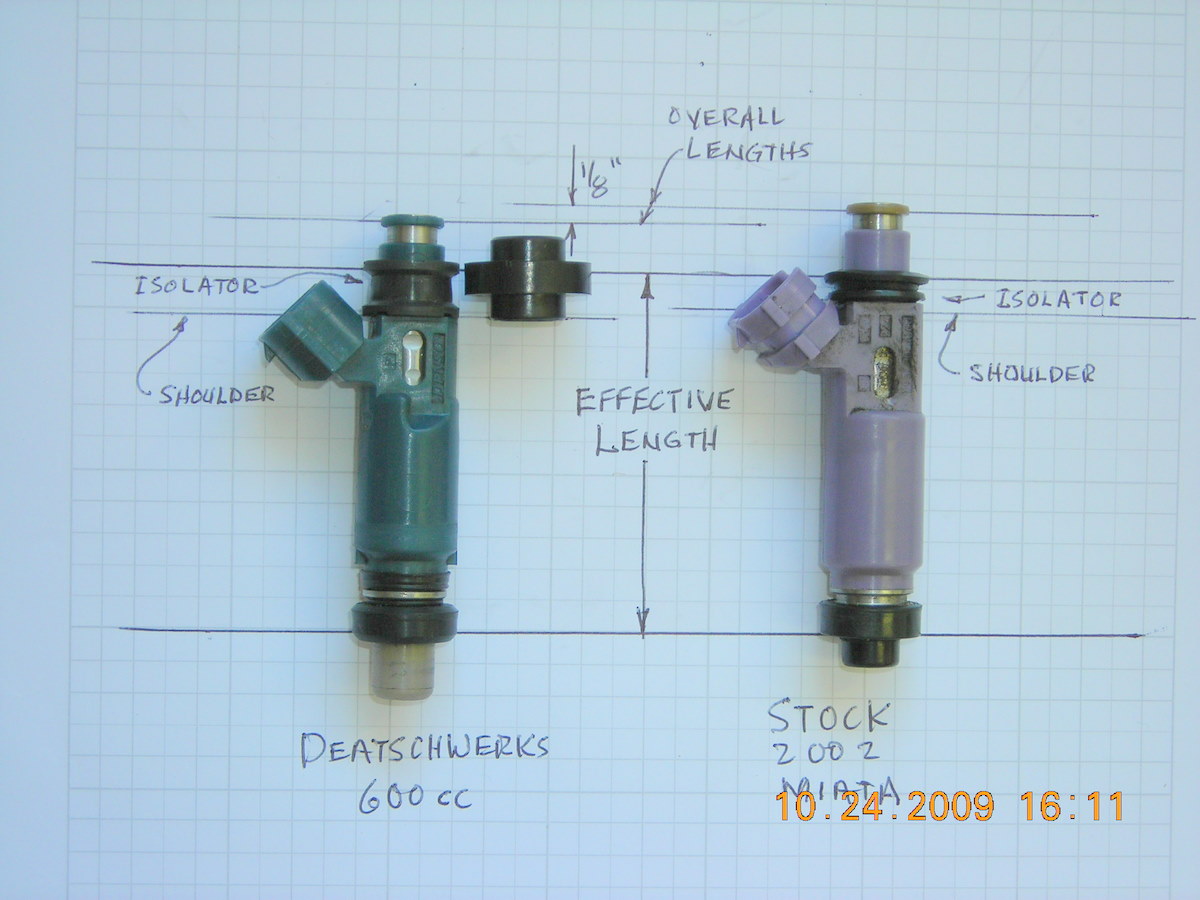 4. The “effective” length of an injector is measured from the base of the lower seal to the top of the upper isolator. Selection of the proper length isolator is important to assure a proper fit for the specific Miata year model. See attached photo of both my stock 2002 injector and my DW 600cc injector. I didn’t have an early stock injector but you can refer to a photo in an earlier post in this thread that the location of the important elements appears to be the same for early and late injectors.