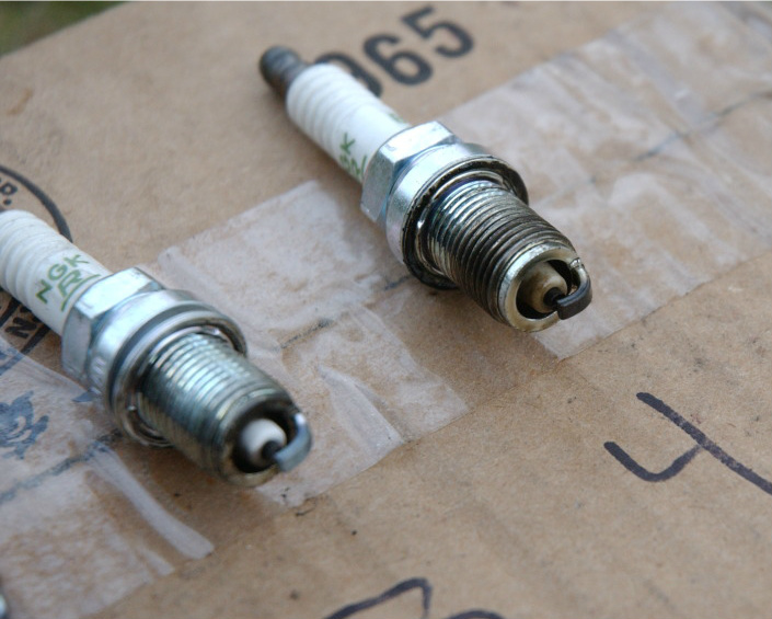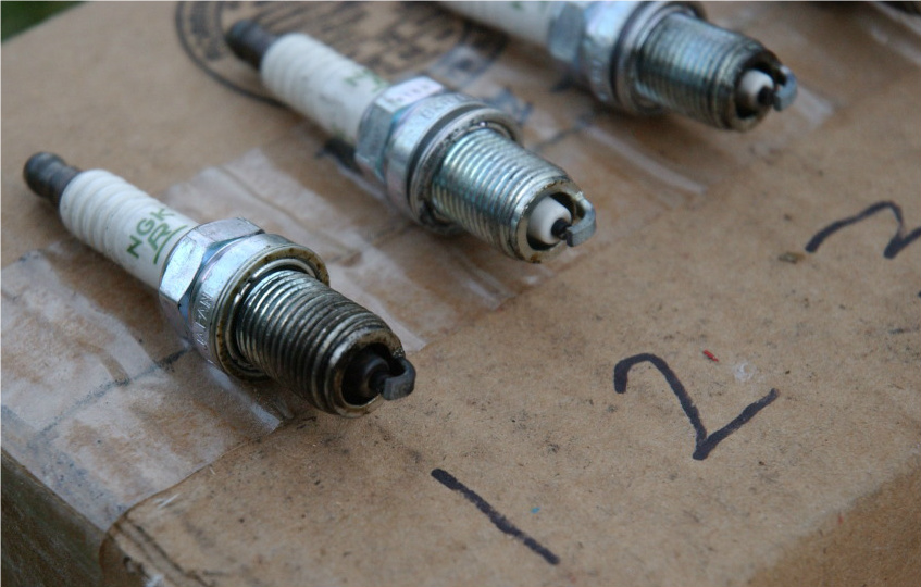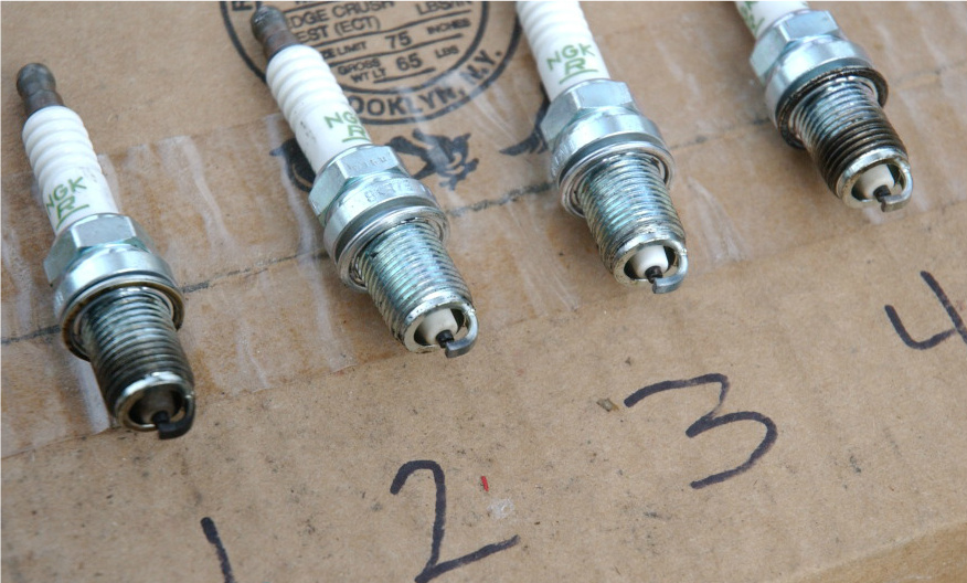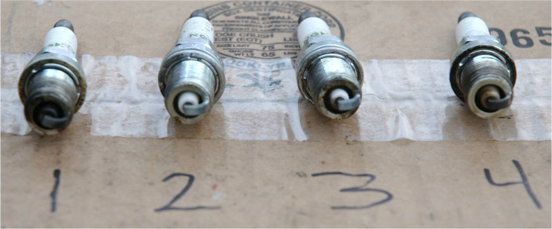 I replaced the coil pack and the spark plug wires with ones from a running car. Very little to no change in how it ran. At this same time I put in new spark plugs. Here is how they looked after ~ 1 minute of running (using throttle to keep it running):