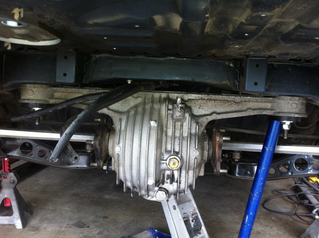 The diff is in the car as well. Boxed in the front diff mount with like 1/4" steel so that its now a solid mount. I also flipped the solid diff bushings upside down so that i could run the diff as high as possible (~1/2" higher). The front mount still worked with no modification for the height difference. Make sure that if you run the bushing flipped like this that you add washers or thread the mounts higher, because without the bottom rubber piece the nut will pass the threaded part and get stuck, if you're unlucky like me.