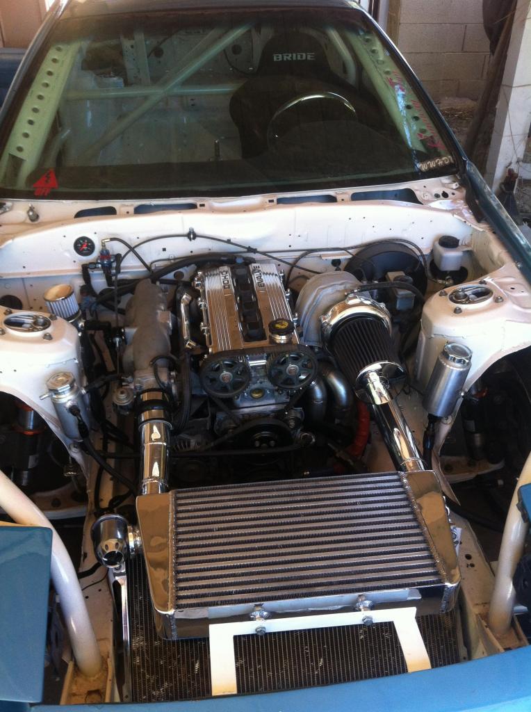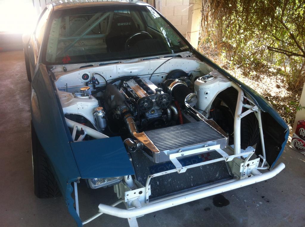 I got significantly closer this weekend to finishing the car, even though it doesn't look like much. I took the car over to my buddy Joe's house and finished the rest of the fabrication that needs to take place on the chassis. Everything except my fan shroud from here on out just requires buying ****. Car only needs a driveshaft and the powersteering lines now. George will be wiring soon hopefully and we can start the car and get it tuned blown up.