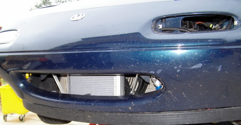 looks like I[ve got the same Ebay 25row cooler... My miata is track only, so I don't need the parking lights (or headlights for that matter)... and obviously it'll be ducted in pretty well. Half of the opening will be ducted to the radiator, the other half to the cooler. If you had to retain the lughts, then you'll be stuck putting it somewhere in the radiator area. Vmount the intercooler and put the cooler up front, or vice-versa?