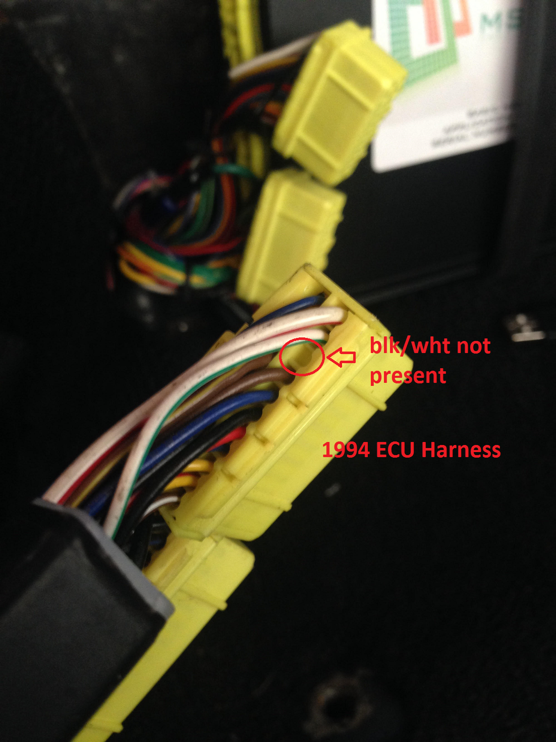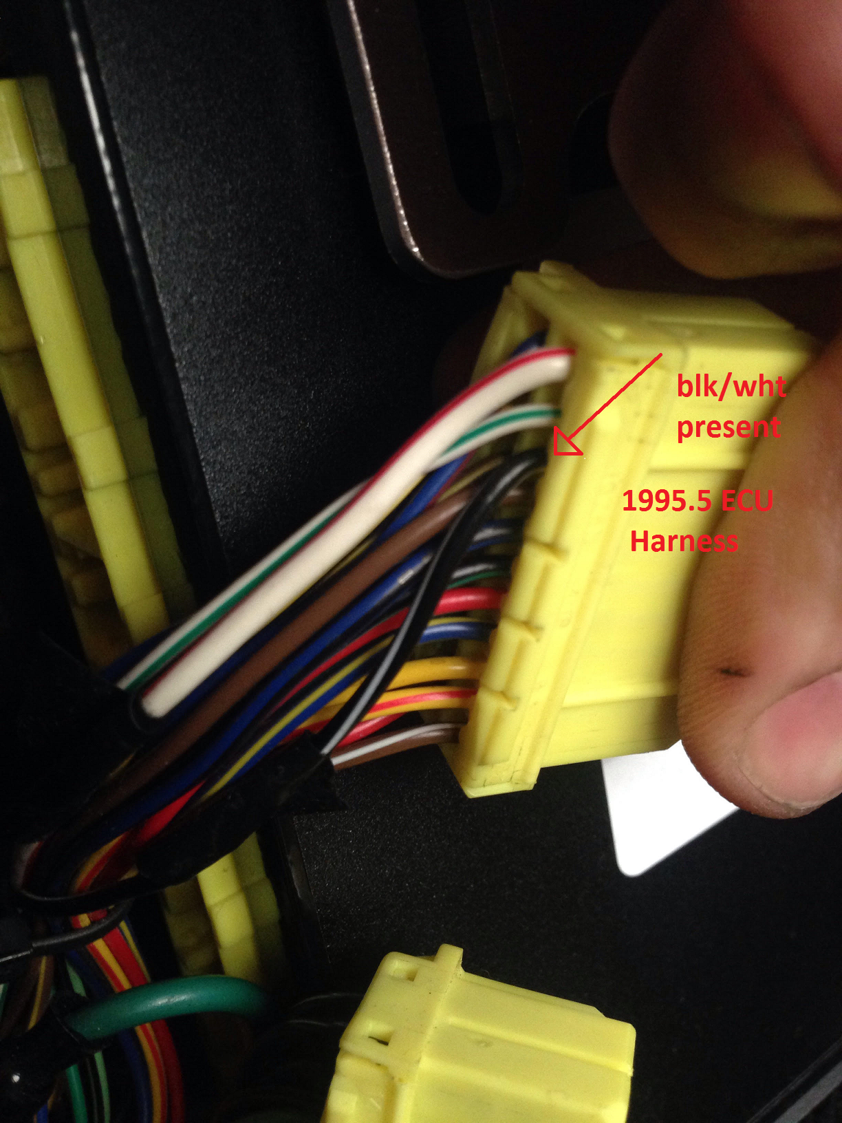 I had a spare 94 harness from a 94 manual... The ECU is a "BPE8" and I noticed the ecu harness is missing one blk/wht wire compared to my 95.5 ecu harness...