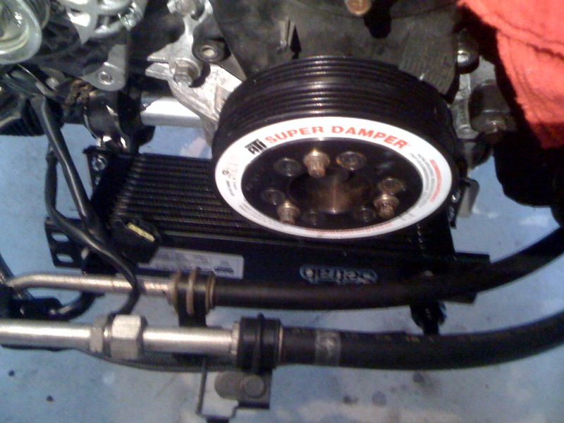 Well I'm still waiting for the FM uber head to arrive, It will be here on Wed. While waiting of course the shipwrights disease has set in with full force. I figured, while i have the head off I might as well do the coolant re-route. Got the BEGI unit and it waiting for the head to come. I also decided that I should have done a oil cooler during the first phase so that has been installed, It's the FM Setrab setup. Also installed a ATI damper. Definitely need the right tools and patience on the damper install. It's a interference fit and went on nice and tight with arp lube.