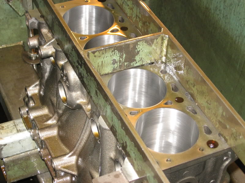 Next was honing, we use a kwikway power hone, location is not important on honing due to the honing head being able felxible and can follow the bore, stone pressure is important, The operator watches an ammeter that shows load on the stones, this indicates the shape of the bore. The operator frequently checks bore size with a dial bore gauge, and steps down grits, normaly a rough grit is used to get within .001 of the finial bore size, next a finish stone is used to bring to size. And last plateau stones are used to knock down the peaks of the cross hatch to give the rings a better surface and allow for faster break in.
