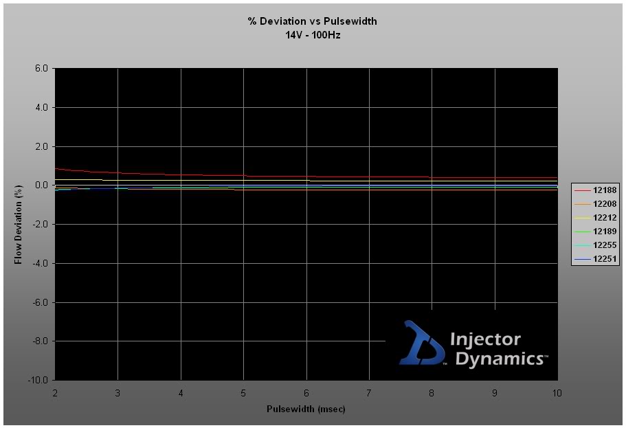 That's an impressive chart. It certainly pays to buy in bulk and do your own testing. At such low pulsewidths, that's going to be A LOT of variation in volume with a 2000cc injector. I understand why you preach ID, and how you manage to get a better than stock idle with and injector that flows 10x more than stock.