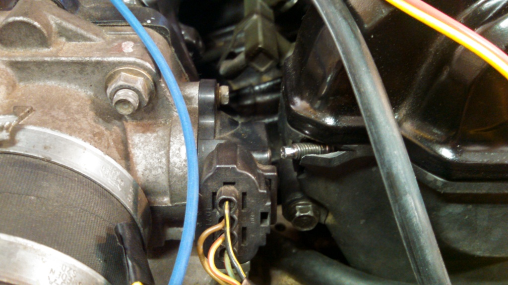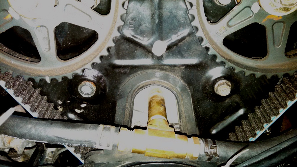 I noticed a small bolt sticking through the upper timing belt cover right below the valve cover. I pulled the valve cover and timing belt cover and found this.