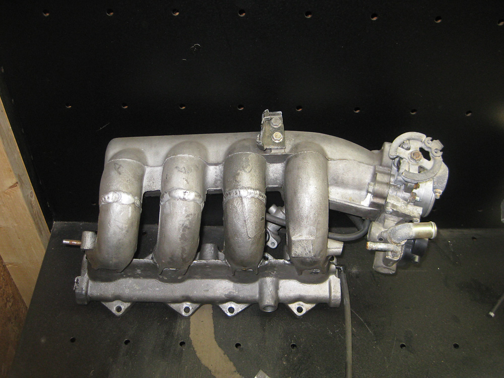 Here's the solomiata hybrid B6/Kia FE3 intake manifold. This fit under the Miata hood with some of the bracing notched and a relatively high engine height. It made 280ftlbs/300whp with a 60AR/50trim T4, 48AR Stage III T3 turbo, 1.6 Miata TB, internal WG, 3" exhaust, MiataLINK ecu. I do think the tiny plenum was hurting top end, as torque fell off pretty bad over 6k.