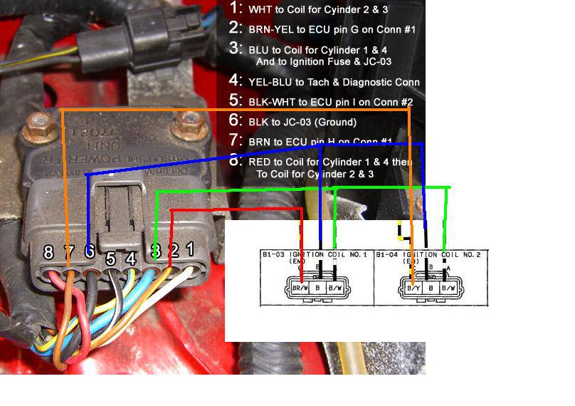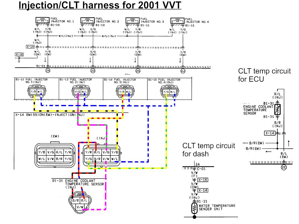 Thanks for all this info, everything but the injector/clt harness worked for my usdm 91 vvt swap, since I had batch injection originally. The coils were slightly different too, as I had ground right at the igniter I could use so I didn't need the ground from the condenser, I just gutted the igniter and ran the 4 wires from there to the stock 01 coils. Here's the "for dummies" diagram I used for the coil wiring, same thing really just usdm version for reference. Other than that I just had to wire my injector/clt harness for sequential. Everything else was exactly the same. Thanks again!
