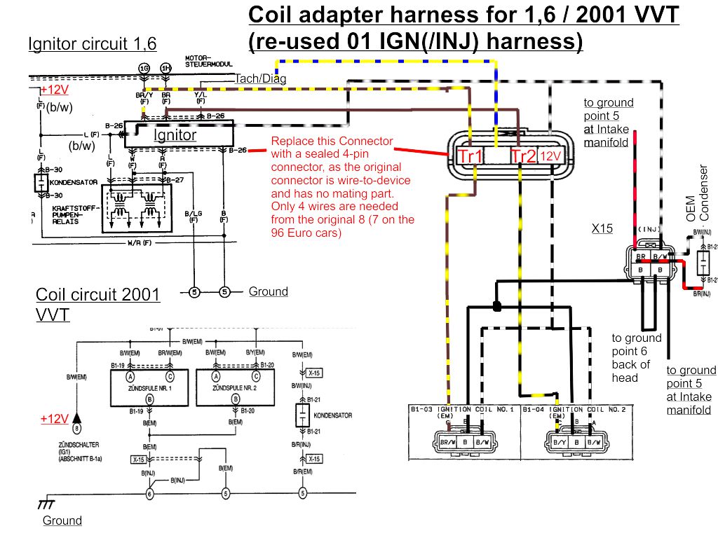 Ditto the above! Thanks for these wiring diagrams, they are what I used for my VVT swap into my mk1 1990. For the 01 coils I also gutted the mk1 igniter and soldered the wires to the pins as above but I just ground the coils directly to the head rather than the ground in the igniter? I also soldered pins 4 and 5 together in the igniter and connected the tach output on my Megasquirt to the black white wire at the ecu harness (which goes to pin5 at the igniter), this then drives the rev counter using the original wiring.