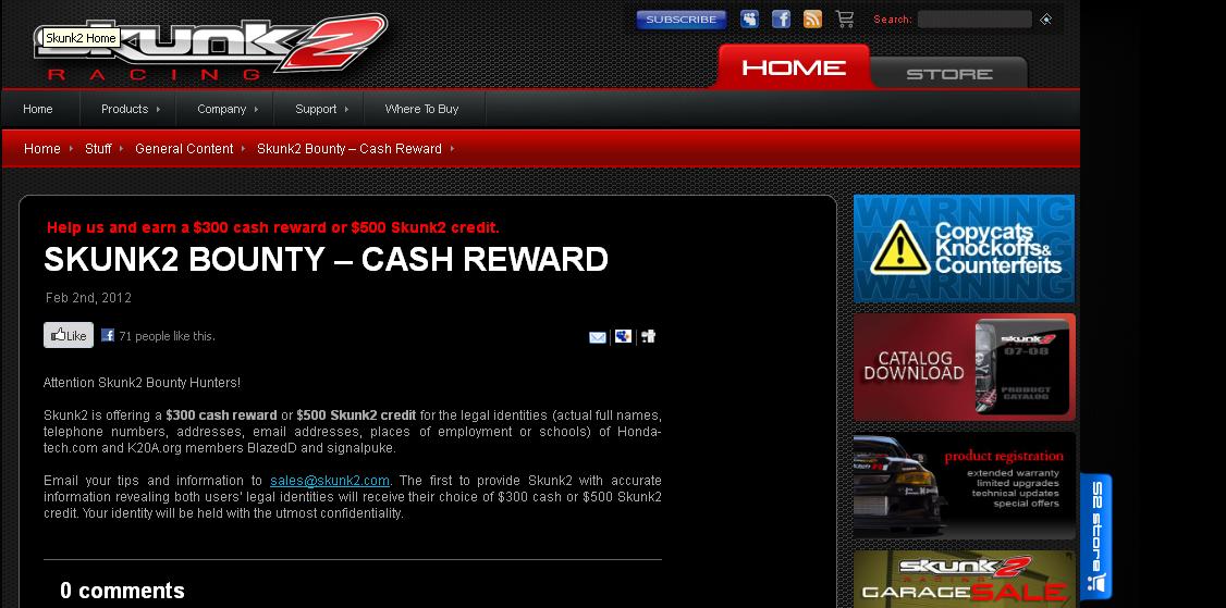 So from skimming a few threads I gather that they get their supply from cheap chinese/taiwan manufacturers, flip it for huge profits, claim to do R&D in house but don't, and put up a bounty for two honda forum users after basically talking ---- and calling them out on it? Either way, true or not, the whole thing is very sketchy. Product quality aside, the whole bounty thing blows my mind. What do they hope to accomplish if they even found these guys? Beat them up?