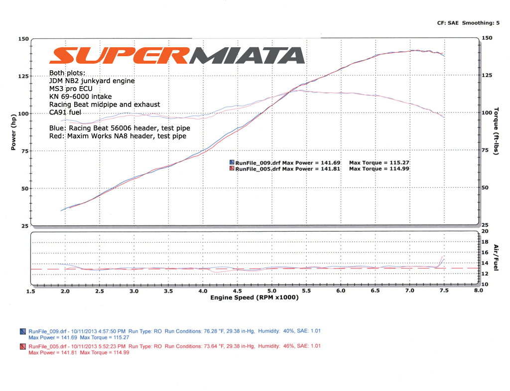 This matches other testing we have done with expensive, high end headers. Hard to best the Racing Beat. They make power, last forever and are very affordable. The only header I think might have significant gains is the Maruha VP. We're procuring one now. They're made to order so it'll be a while before we can post test results