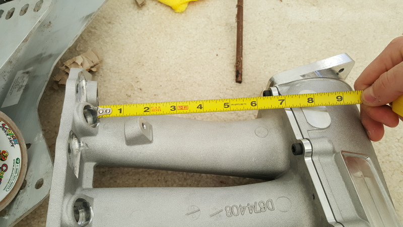 I was a little off. Looks like 7" from injector bosses to bottom of plenum, another 0.5" or so to the end of bell mouths and 3/8" for the flange. That gives me a little less than 8" runners.
