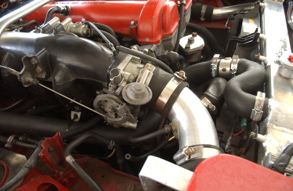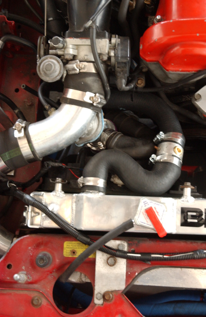 I'm surprised by how much of a rat's nest it is under the front of the intake manifold now with that snake of a radiator hose taking up what little room was left, but hey if it works I'm not complaining!