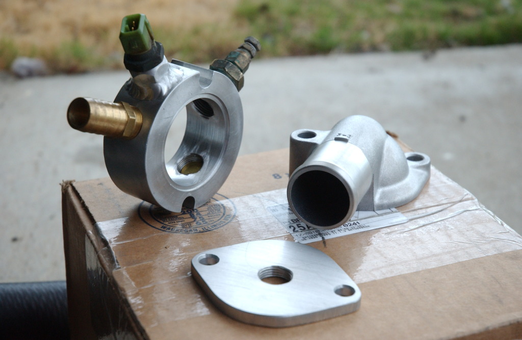 I kept the thermostat intact and ran a hose from the barb on the spacer to the hard line that runs under the exhaust manifold and back into the mixing manifold to circulate water when the thermostat is closed. Warm up does not take long with this method, but idling temps are quite low - the car wanted to hold about 155-160* on idle before I drove it, and that's with a 180* thermostat. Goes with the territory of adding a bigger (55mm) radiator and a reroute I guess.