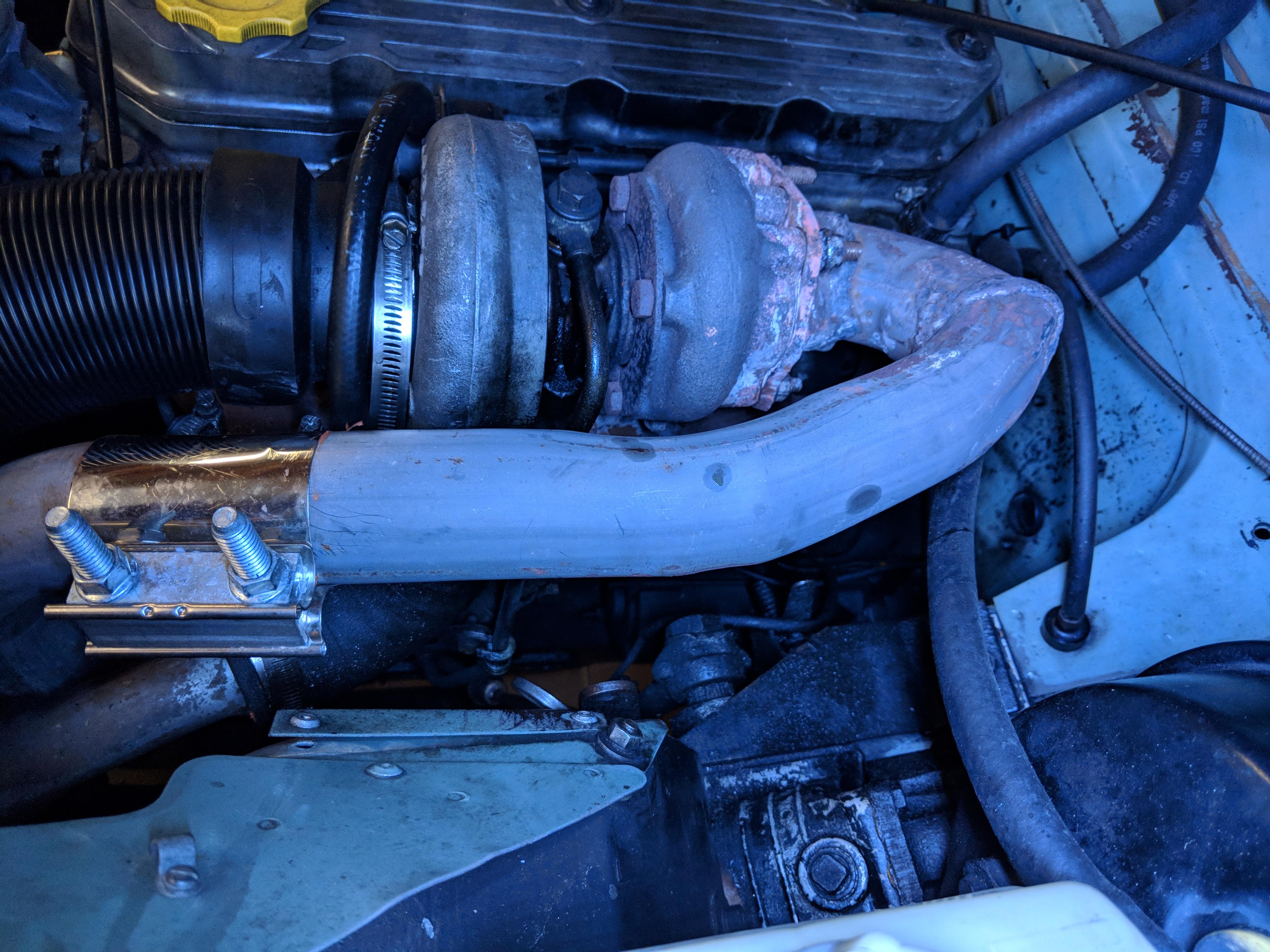 Removed the horrible downpipe from hell (worst thing I've ever seen in person fabrication wise) on my 200tdi swapped '73 Land Rover Series III with a buddy a few weeks back. We got partway through completely custom fabbing a new downpipe, had to adapt to the crappy exhaust so I could get home though. So we finished the initial part of it, from the current Vband it will then go forwards in full 2.5" and curve down into that tiny open space within the front fender/wing and back under the car.