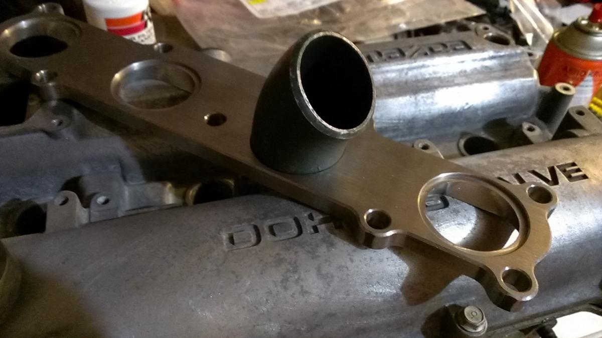 The opening in the T25 flange is a bit larger than the turbine inlet on my SR20 terbo but it shouldn't be hard to open the housing up to match. Moar spoolz, amirite? I haven't tried it on the GT2560R yet. Either way I failed and did not take a picture. I also failed to check the thread size. I'm HOPING it is M8, but I have no earthly idea.