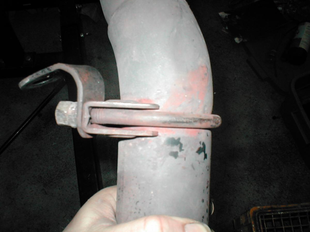 Pictures of my failed U-bolt clamp configuration. I had about 3 of those things fall off even after double nutting them. The U-bolt clamp looks the same Geometry. Even if you tried not to over tighten it would loosen up even without the nuts turning on the U-bolt. Usually it would start rattleing after some hard use. Hot pipe, thermal expansion, and external loading is just too much for the small contact area the U-bolt puts on the pipe.