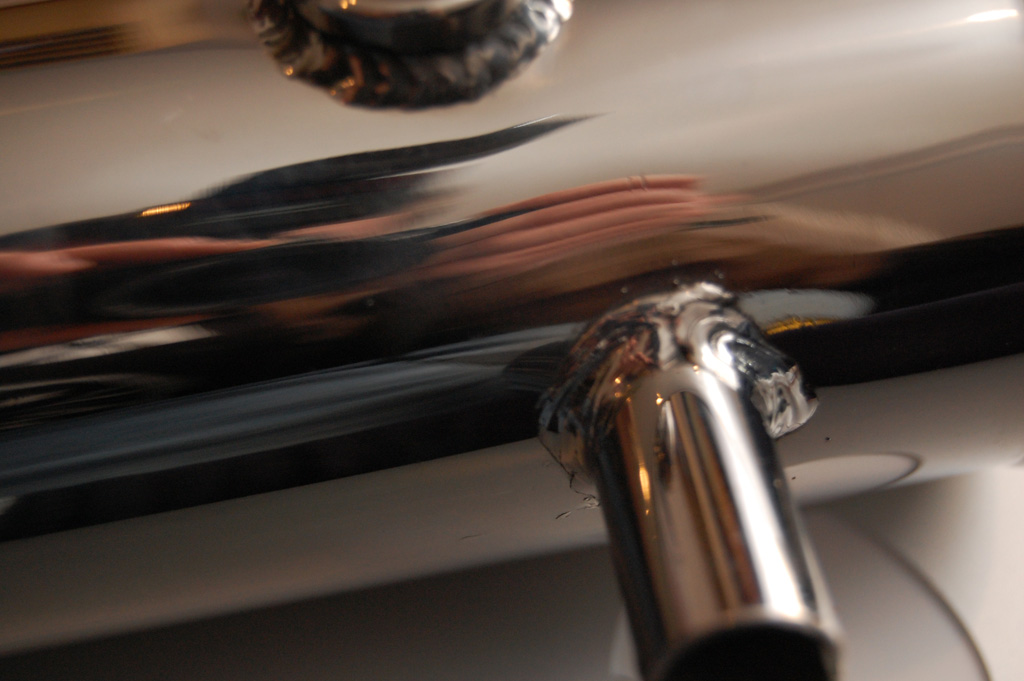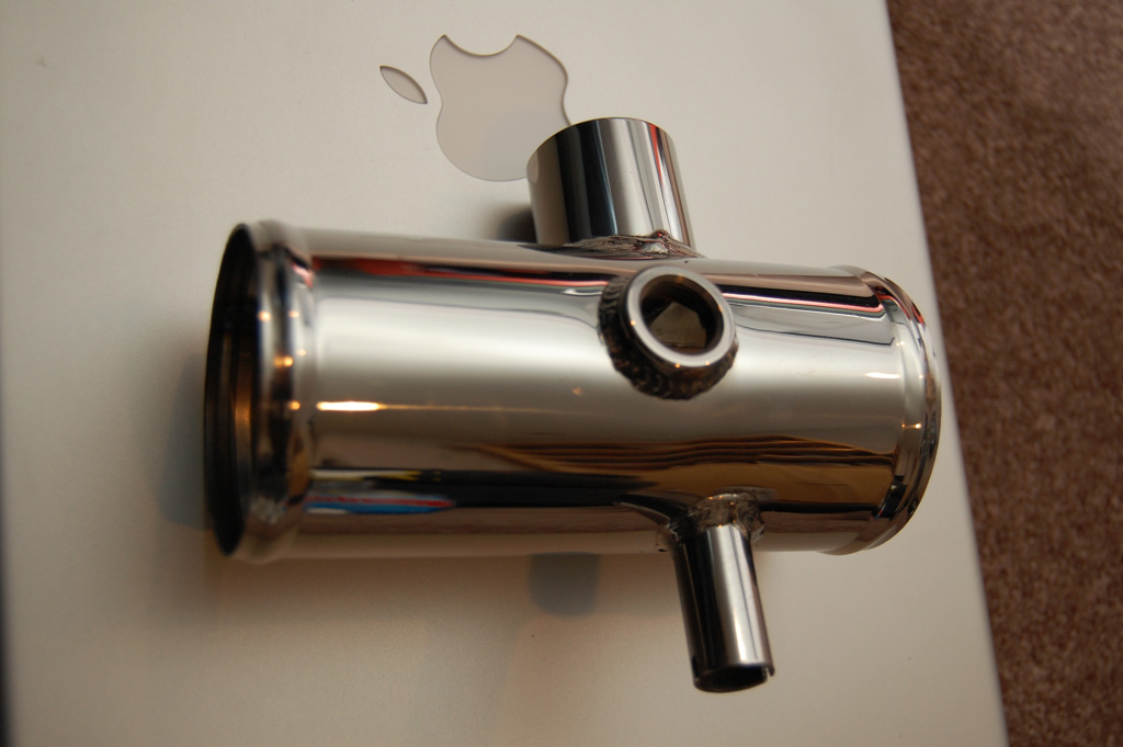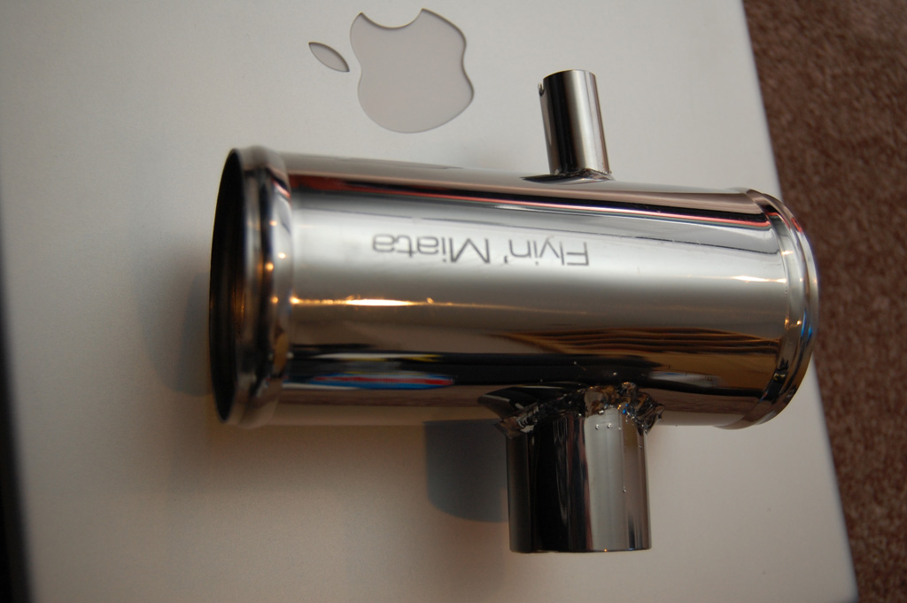 I'm going to post up pictures of the TB pipe I received. This is the same pipe that was posted up earlier in this thread (or was it the other one?) that looked like ***. I'm glad to say mine, while not perfect, looks good. There are three "bungs" welded on it: BOV, IAT, and IAC Valve. The welds range from, acceptable to excellent. The threaded bung for the IAT is exceptional, I think this was TIG welded. On par with my BEGI stainless DP and aluminum heatshield. The other welds are not nearly as pretty, but I'm sure are structurally sound.
