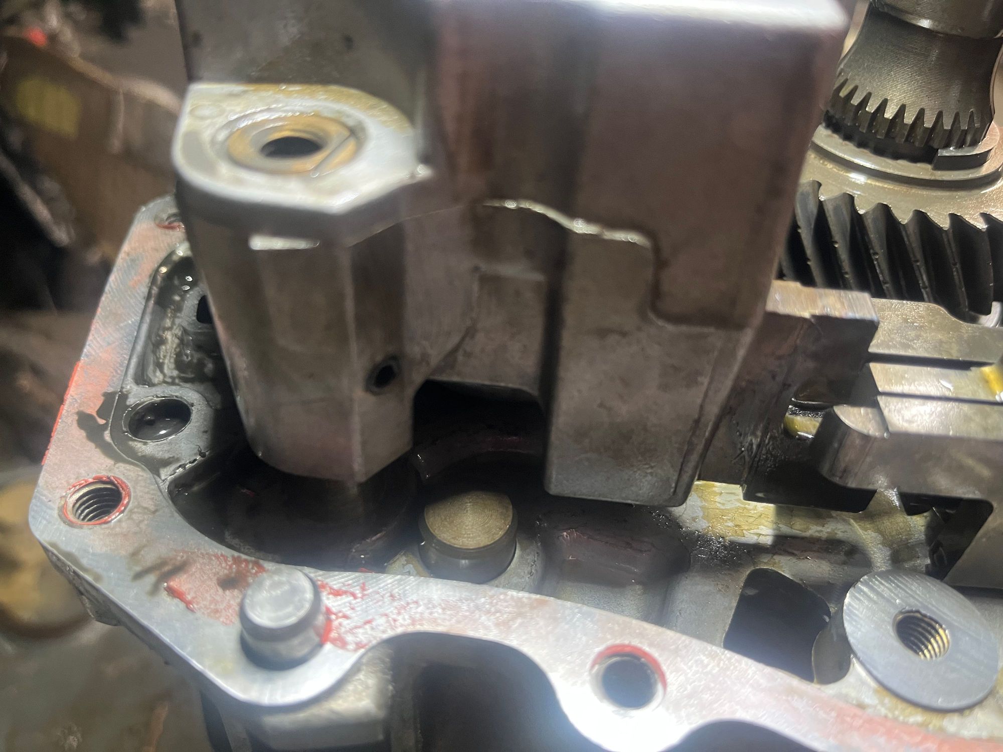 I believe that as long as the sensor is to the rear of this notch in the 6th gear shift fork (rear being “above” in this photo) it won’t interfere with the rod.