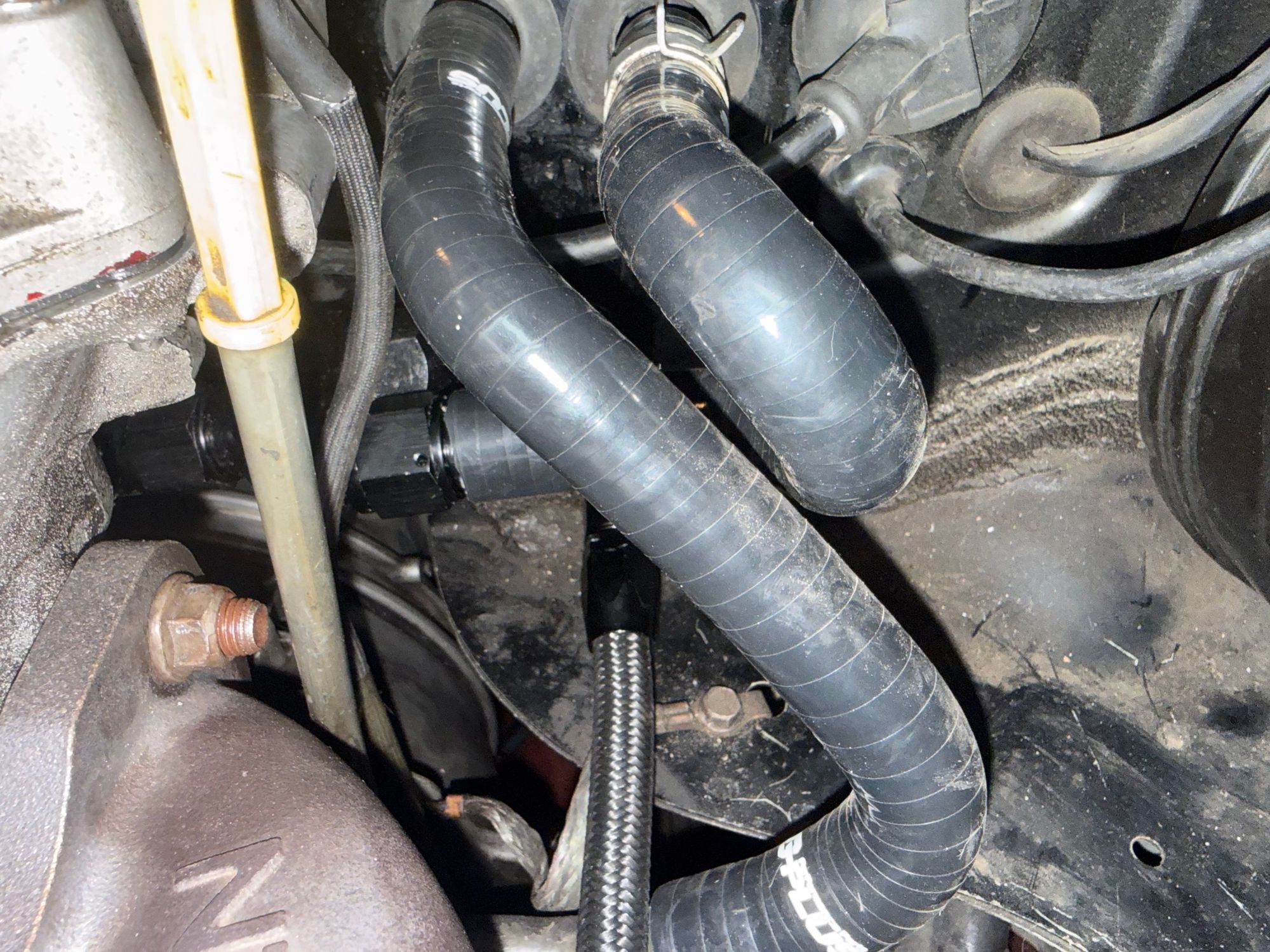 Rear turbo waterline connected to the coolant reroute housing.