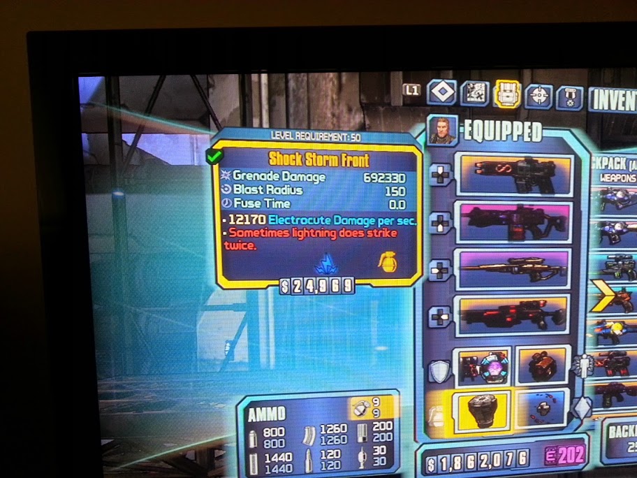 Got a new grenade mod that deals shock damage on an enormous scale. Direct hit of the main unit will pretty much one-hit kill anything that isn't a boss (and will get some of them.) Upon explosion, it shoots 7 other mine-like things. They seem to be dealing about 217k when someone gets near them.