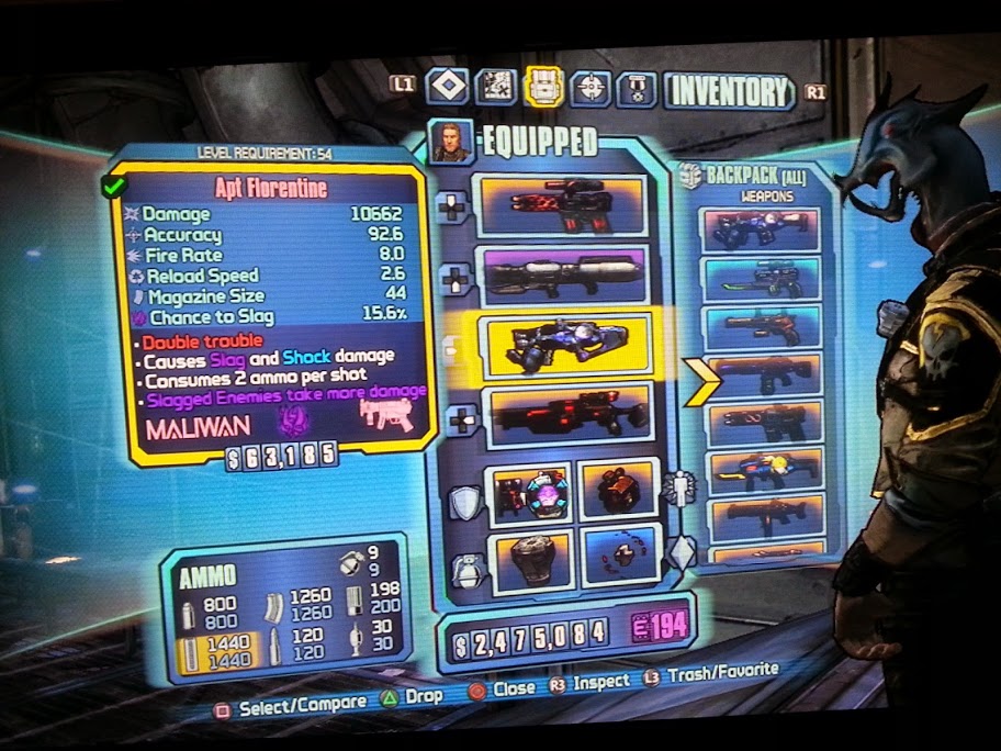 I just finished up TVHM mode. Cleared every last mission (including all expansions), defeated (solo'd) every last raid boss, including the hidden one in Hammerlock's expansion, Dexiduous the Invincible. Dexiduous dropped a Chopper machine gun. Has a 1295 round clip, and you can't stop it. Hit trigger once, and it dumps the whole thing, fire rate is 18, which is nuts.