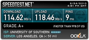 I wish I could claim that speedtest as my own. I captured that one a couple of years ago while I was doing an install at KSCR, on the USC campus. What's really amusing is that all it actually shows is that I've maxed out the ethernet port on my laptop. Who knows what kind of bandwidth the switch I was connected to was capable of accessing.