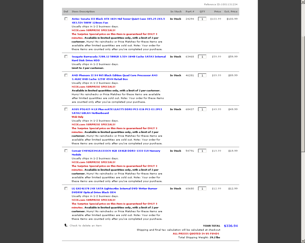 I just think for what you're going to be doing people are suggesting things that WAYYYY exceed anything you'll need. Then, on the other end, people are overlooking some of the more important aspects of a computer. This thread has gone on long enough, and i do not feel any of my input would be helpful at this point. Not trying to rant, but if you want a cheap computer, there is no better time to learn to build your computer than right now. I have always ordered my parts from NCIX.com and have gotten away with very cheap machines that fully cover my needs. Personally, for your needs, I would just do something like this (yes, I wasted part of my work day to build this just to show you): Attachment 185774 Total is: $336.94 That leaves you with 4GB RAM which can be EASILY upgraded to 8GB, a 500GB hard drive, a decent motherboard, an amazing case that comes with an ANTEC power supply, good RAM, and more than enough processing power. If you want to dual-boot Linux, there is plenty of space for that. If you want to upgrade to a better sound card, no problem. After building the computer, you will be able to upgrade it later since you know it from the inside out :) Mind you, that doesn't include the OS. Nor does it include all that bloatware that comes with pre-made computers... Anyway, just my :2cents: and my workday rant. |