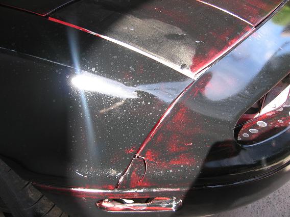 Ok so i got sick of just talking and went out and took some photos. I rolled on the first coat yesterday with a pretty thin mixture of brightside black using a shurline foam roller. Apparantly my sanding was not perfect as there are some sanding marks that show thru on picture 4, though they are quite superfucial and so hopefully they will cover up with a bit more paint. Also, I am not quite sure what to do about that tear in the bumper on picture 2.