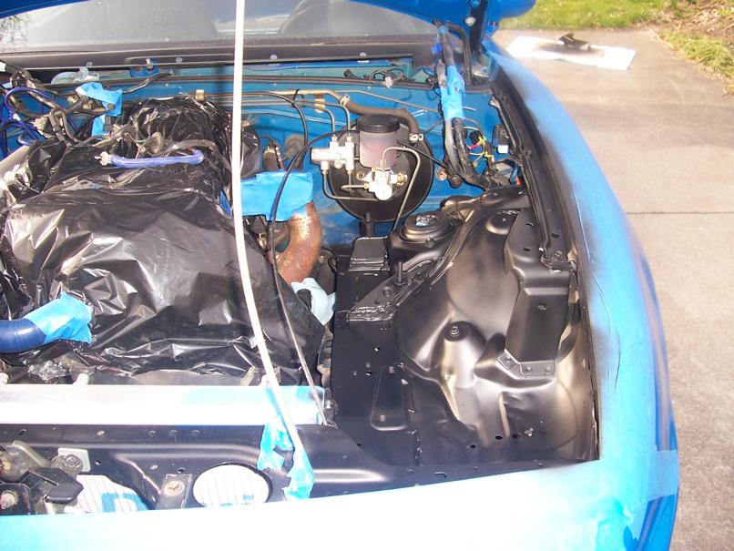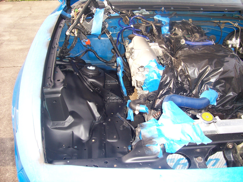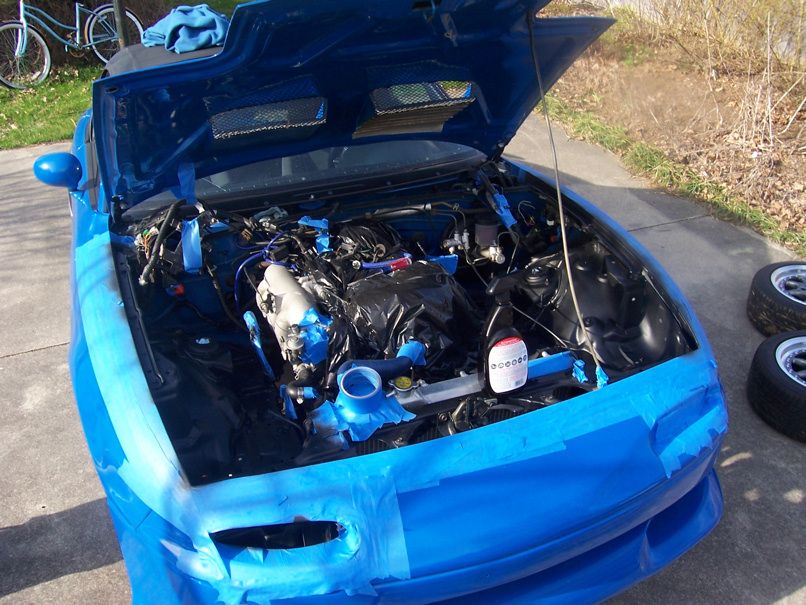 Painting is a slow progress but steady...should be done soon. I think the flat black will clean everything up very nice. I'm also going to get some black wire looms and try and re-route and hide some of them bitches. Charcoal canister is gone. The new CF hood is here and the AAC headlights will be here Monday.