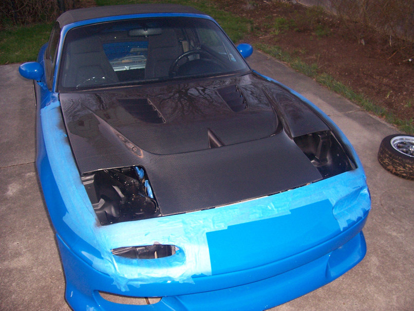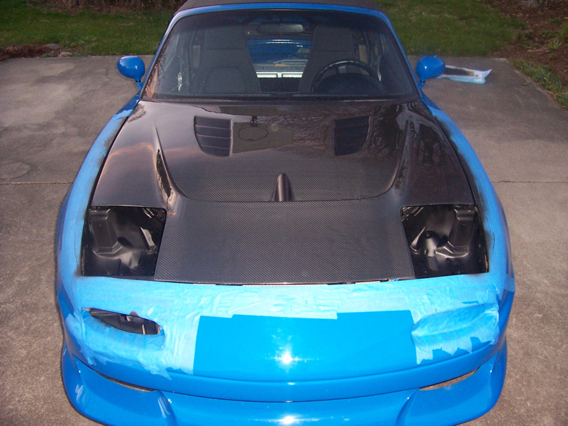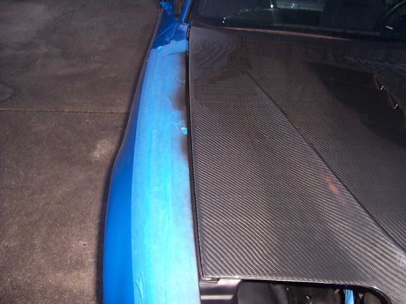 In any case, the hood looks great! I'm really glad I painted the sides of the fenders black, I think it would have looked like **** being blue. No clearance issues like someone said earlier. I cant decide whether I will add hood pins or not, I probably will to keep the hood from bouncing on the highway. Gaps seem even, CF looks awesome. All and all I am a very happy customer. Now I just need to add the black mesh, drill a hole for the hood prop, and decide on pins. Now I wait for the AAC CF healights to get here...