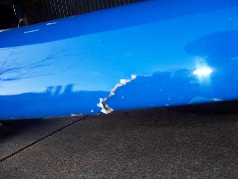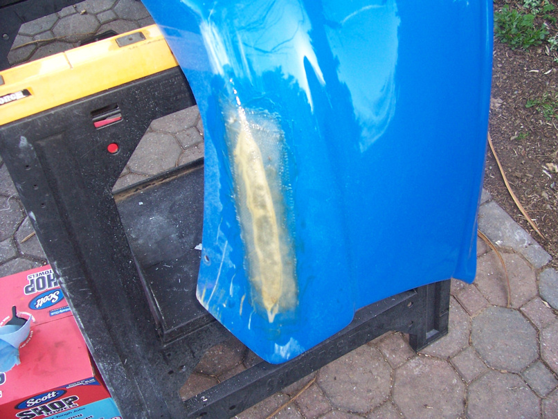 Got the back of the car apart. Cleaned up and rough sanded the spot in the rear bumper. I never used fiberglass before, but I just went for it, I figured it really cant be that hard. I got 4 layers on the front, and 4 layers on the back. Its already just about rock hard. Tomorrow I'm going to sand it and get me some filler to finish it up with. I will get this bumper completely done, and ask my bodyshop guy how I did. Hopefully good enough that he can just paint it and I can save some money.