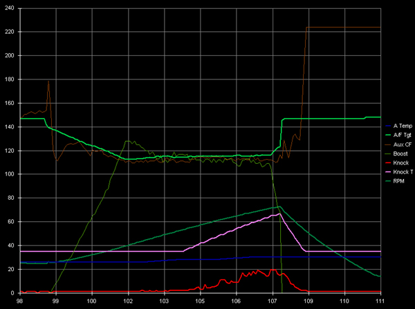 I think 230-240 is easily doable with a gt25r at 15psi. Looking at my datalog, I was spiking to 13 and settling to 11. On my second run of 214hp, I turned the boost up to 12psi and made a fuel correction. Unfortunately, I forgot to increase my boost limit which caused my hp oscillations.
