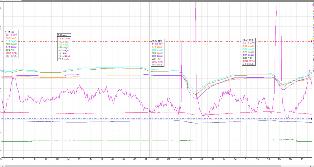 The marker lines on the graph show the brake pressure (green). Pink = RPM, Purple = AFR, Dark Blue = Speed, the 4 colours close together are EGT's.