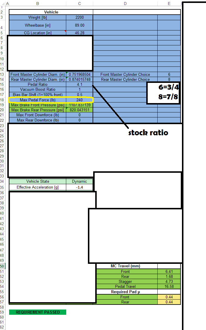I definitely overlooked the fact that dual masters split the pedal force in half at each master. I only validated brake bias with my spreadsheet, and forgot to look at overall pedal force. Dual 5/8" may be doable with a pedal ratio change, but I think I may look at a single master booster delete.