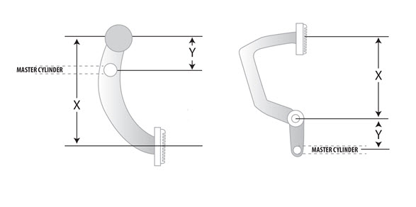 In a manual brake system, the pedal ratio will be between 5:1 and 6:1 and a power system will be between 4:1 and 5:1. In the above illustration of the hanging pedal on the left, let’s assume the overall length of “X” is 12” and the “Y” measures 3”. That puts the pedal ratio at 4:1 which is perfect for a power system. To make this function as a manual system, the “Y” measurement would need to change to 2” giving a 6:1 ratio.