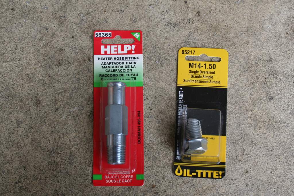 - M14 x 1.50 oil drain plug with washer for thermostat cover (from Pepboys $1.99)