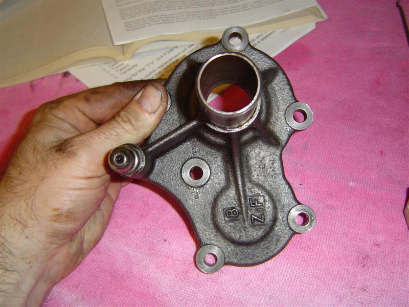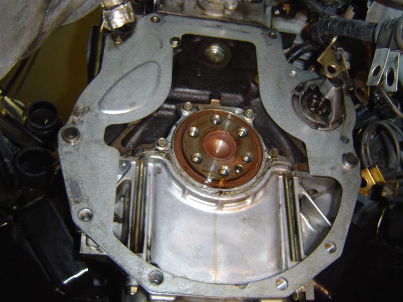 4. Pulling out the rear main seal took a few minutes. I didn't mind scratching it or even destrying it, but I didn't want any damamge to the metal seat it's in. I used a couple dental pics and a very tiny flat bladed scredriver and after a bit of coaxing, it came out. VERY IMPORTANT NOTE: Whe you put the new rear main seal in, don't push it in as far as it will go, it just needs to be flush with the lip. I pushed mine in a little far, but just made sure it was "evenly" too far in and I'm hoping for the best... shouldn't be a problem.