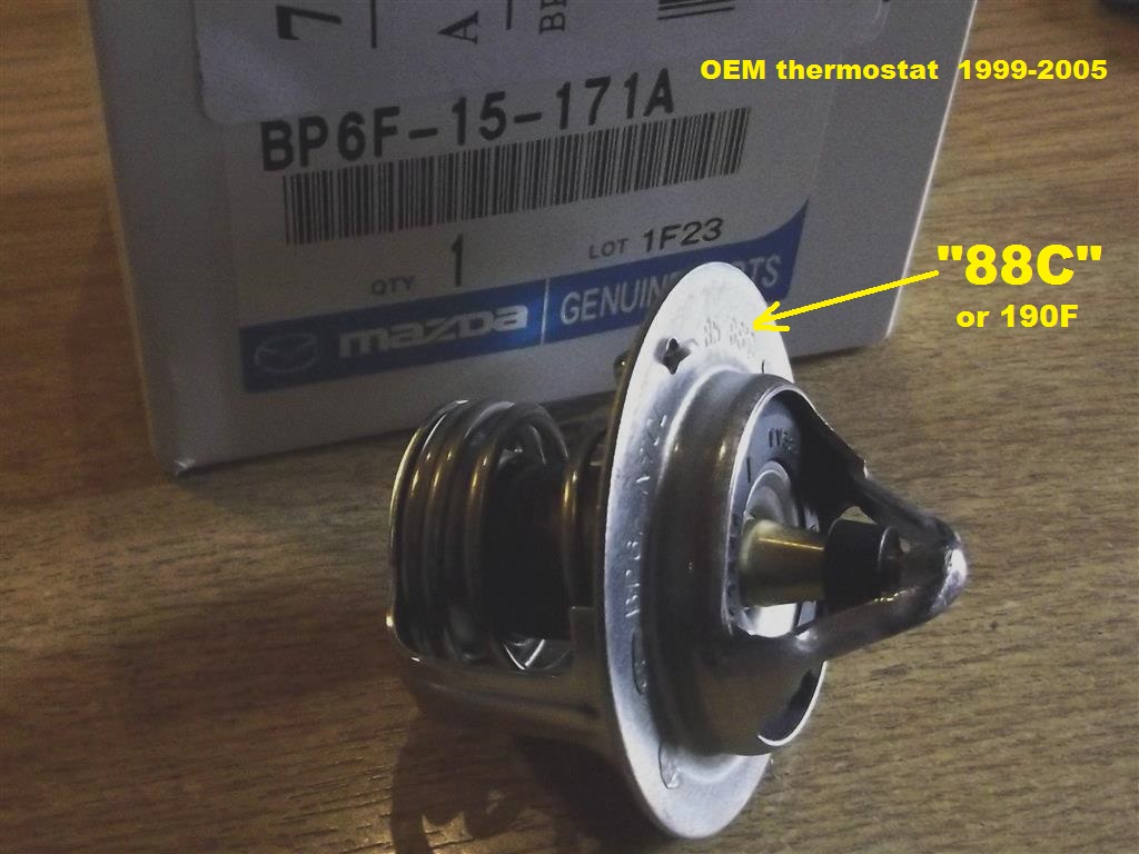 Read through MANY pages in several threads, and found a lot of what's looking to be misinformation. The factory NB thermostat doesn't have a backflow valve like you'll see on NA cars, but DOES have a "Jiggle pin" to allow air to purge from the system. And is 190 deg., NOT 195 deg. as believed by many. After reading about a couple people having OEM thermostats show up DOA right out of the box... NAPA seems to be the best option on the market.