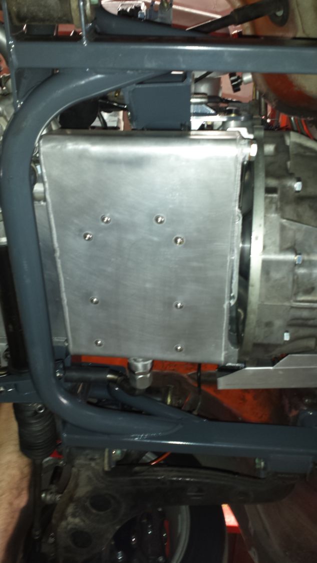 Bottom of the 7 qt oil pan. Button head fasteners in tray are for the internal baffles and trap doors to control oil movement in the pan. You'll note there is no pass through for the exhaust. We rerouted the exhaust to get a better header design and also increase oil capacity by about 2.5 qts.