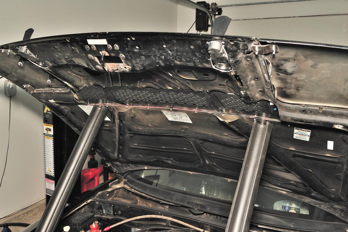 Someone asked for underhood shots. I forgot to peel off that red tape before riveting it down... I have some TB clearance issues up front so the vent is pretty far forward. It looks like a good spot for airflow with it being right behind the radiator. The hood is stiff enough that I'll probably not reinforce it, but it flexes a bit when raising and lowering. You can shave off some of the honeycomb area if you want another 1/4" of clearance. I might do that if the hose clamp on the TB coupler rubs.
